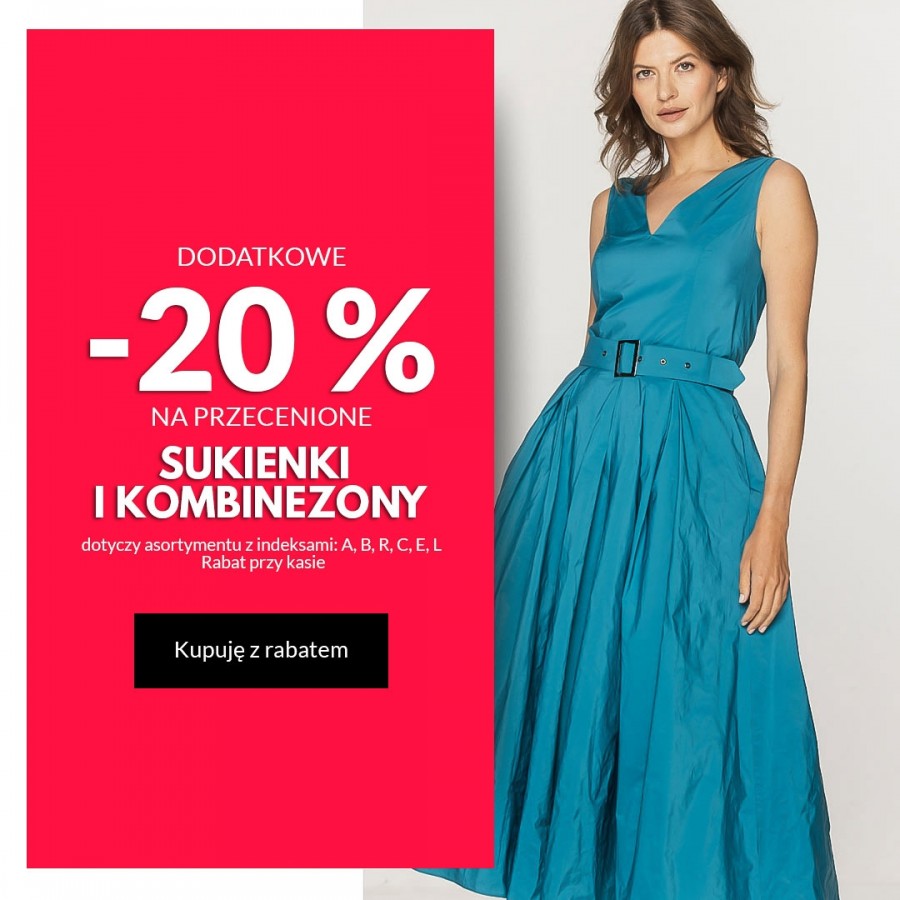 Tylko do 3 września możesz skorzystać z dodatkowych -20% na PRZECENIONE sukienki i kombinezony. Rabat naliczany jest przy kasie.