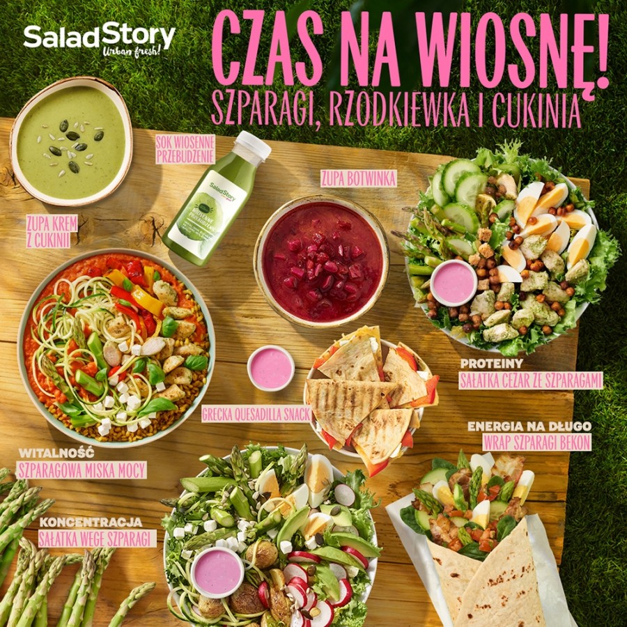 Dlatego w wiosennym menu Salad Story znajdziesz je w kilku odsłonach – w sałatkach, wrapach i miskach pełnych dobra. Do tego rzodkiewka dla chrupkości, cukinia dla lekkości i cała masa świeżych składników, które robią klimat